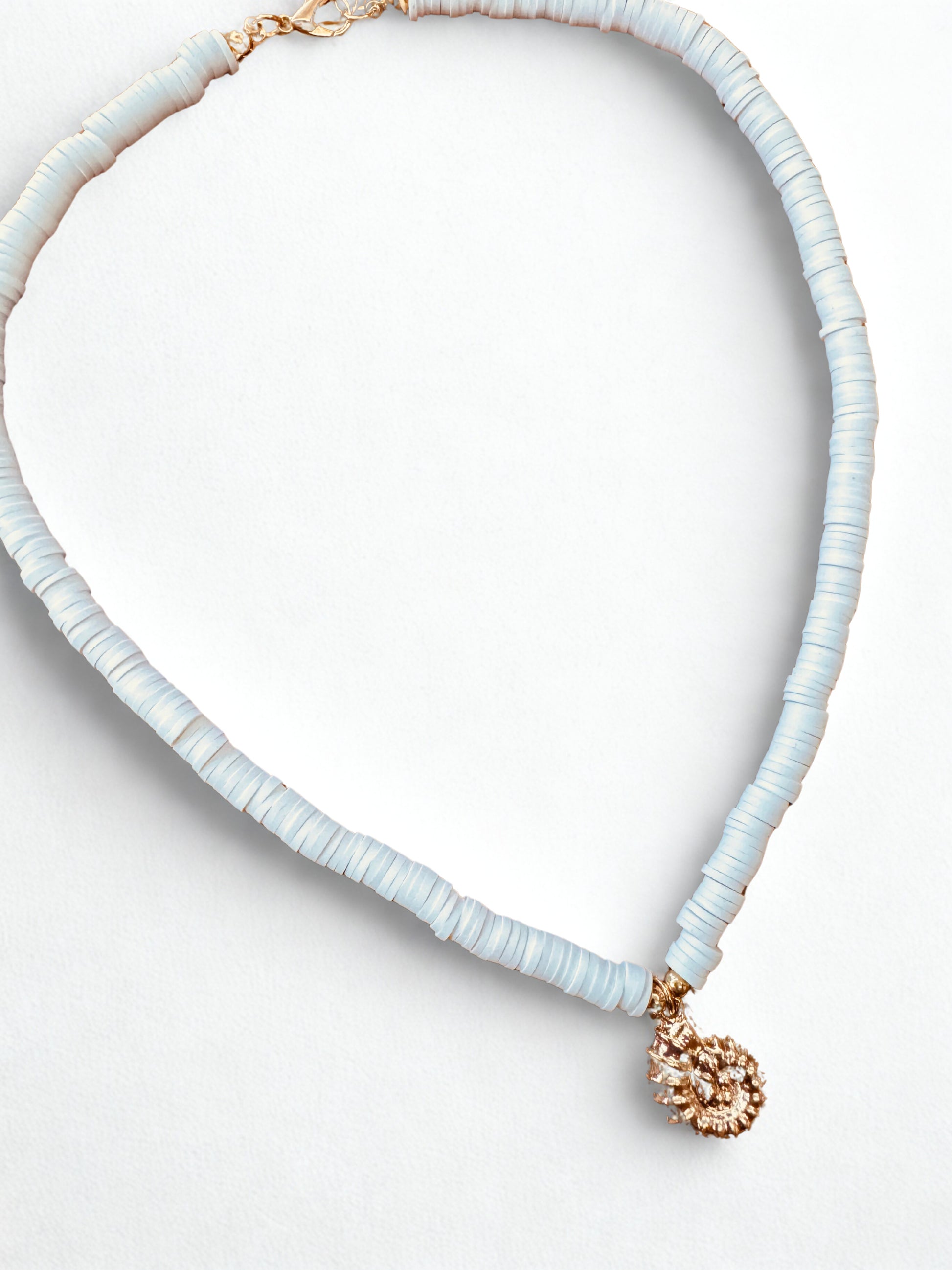 This stylish necklace features a coastal-inspired design with alternating white and gold-tone disc beads strung on a durable cord. The centerpiece is a textured, metallic gold nautilus pendant that adds a touch of seaside elegance. Perfect for summer outfits or beach-themed looks, this accessory blends casual charm with a hint of glamour.