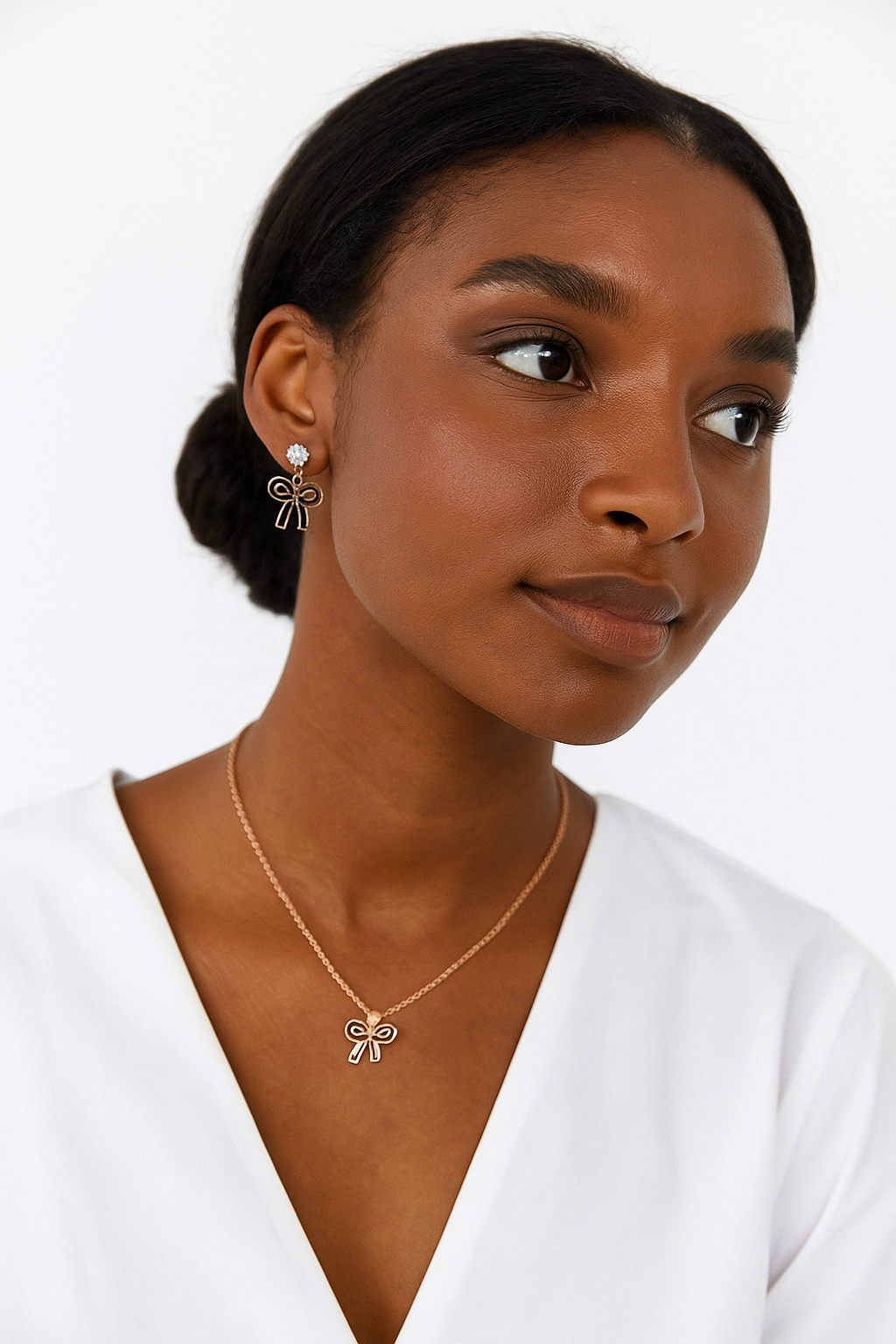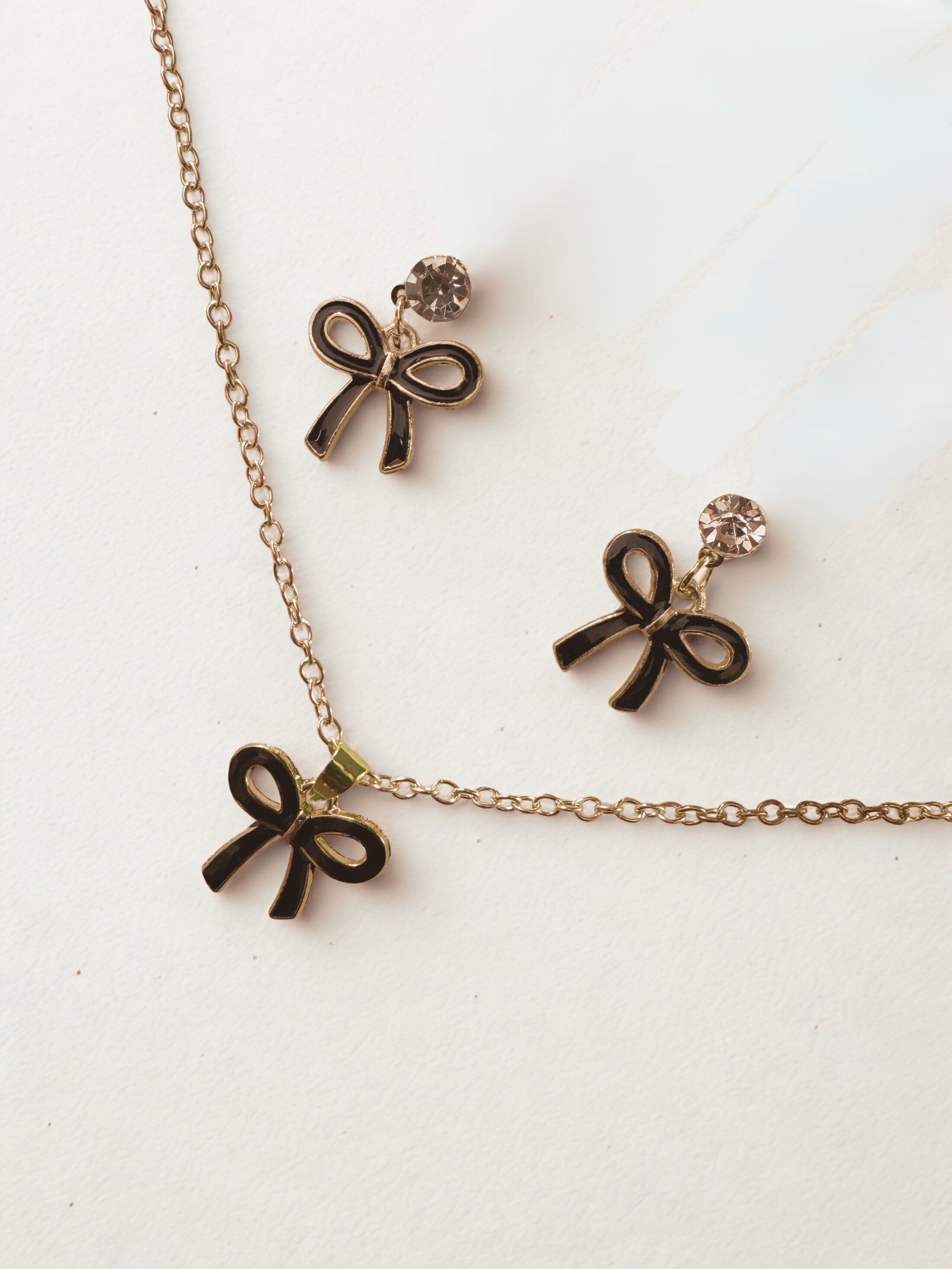 Featuring a delicate gold-tone chain necklace and matching earrings, each piece is adorned with a stylish black bow pendant. The earrings are further accented with sparkling crystal studs, creating a perfect blend of playful elegance and timeless style.